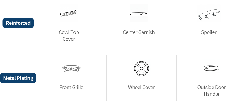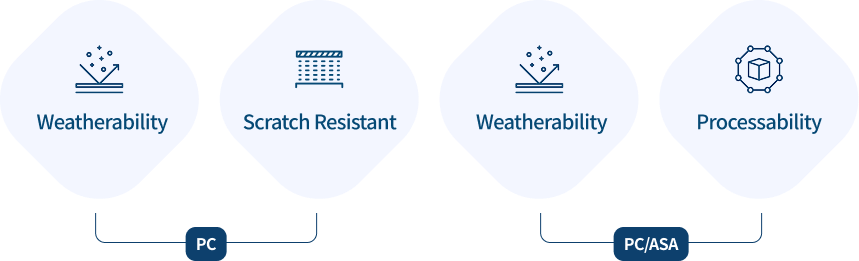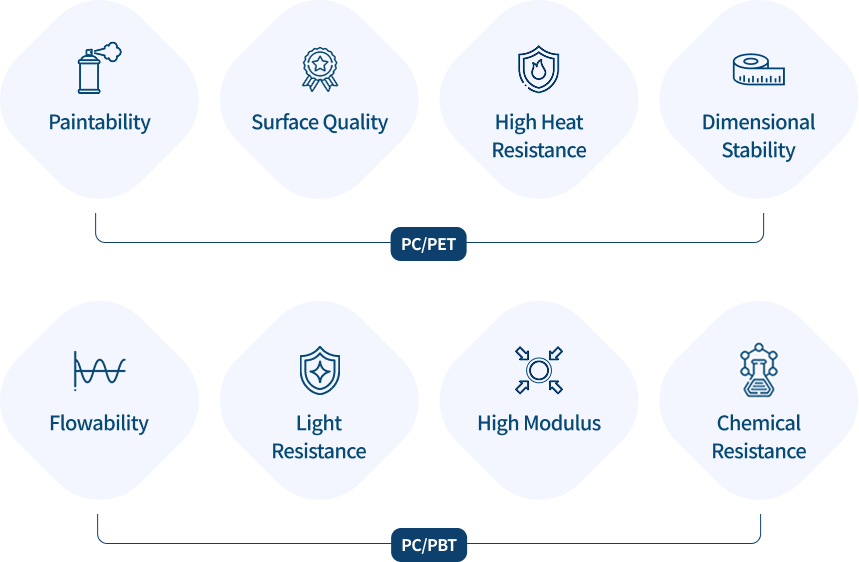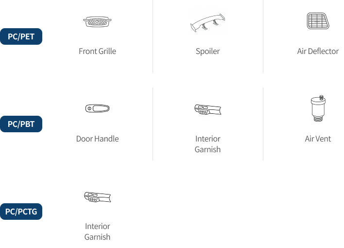 LOTTE Chemical offers a diverse range of products with excellent properties and processability such as INFINO® PC/ABS (reinforced, metal plating), PC/Polyester, painting-free PC, and PC/ASA.